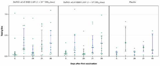 The DelNS1-nCoV-RBD LAIV vaccine could elicit mucosal immunity against SARS-CoV-2, as the vaccine was delivered via intranasal rout. To evaluate the mucosal immune response after vaccination, total Ig in saliva was tested by ELISA assay. The saliva total Ig against SARS-CoV-2 RBD of the high-dose vaccine was significantly higher than the control on day 31 (3 days after the second vaccination) [0.24 (0.13–0.63) vs. 0.21 (0.11–0.26); p = 0.046] (Table 4; Figure 5). The saliva total Ig of the high-dose and low-dose vaccine were 0.31 (0.09–0.61) and 0.31 (0.07–0.48) respectively, which were twice of that in the placebo group [0.15 (0.06–0.53)] on day 56 after full vaccination.