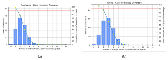 Percent class combined coverage of vaccine construct in (a) South Asia population and (b) worldwide population.