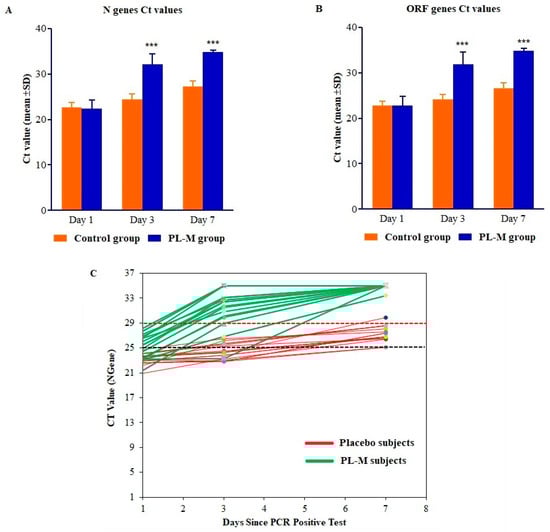 RT-PCR profiles of (A) the N gene, (B) the ORF gene, and (C) change in Ct value of individual subjects in the placebo and PL-M groups. RT-PCR profiles of N and ORF genes detected SARS-CoV-2 in COVID-19 patients on days 1, 3, and 7. About 82.35% of patients in the PL-M group (n = 17) became RT-PCR-negative for N and ORF genes (cycle counts > 29) on day 3 and all patients by day 7. All patients in the placebo group (n = 17) remained RT-PCR-positive for N and ORF genes on days 3 and 7 (cycle counts < 29). Changes in RT-PCR cycle counts for N and ORF genes in the PL-M group at days 3 and 7 were statistically significant compared to the placebo group (p = 0.001) ***.