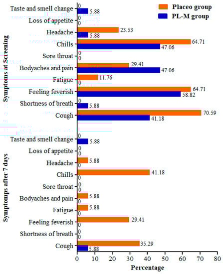 At the baseline, the most frequent symptoms of COVID-19 in both study groups were chills, feeling feverish, cough, body aches, and pain. After 7 days, most of the symptoms completely disappeared in the PL-M group, whereas patients continued to experience chills, feverish sensations, and cough symptoms in the placebo group (Figure 2). Only 1 patient (5.88%) reported having a cough, and 1 patient (5.88%) noted a change in taste and smell. Symptom frequency also decreased in the placebo group; however, 41.18%, 29.41%, and 35.29% of patients continued to experience chills, feverish sensations, and cough symptoms after 7 days, respectively. Additional symptoms such as headache, fatigue, and body pain were observed in 5.88% of the placebo patients.