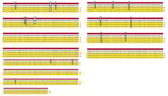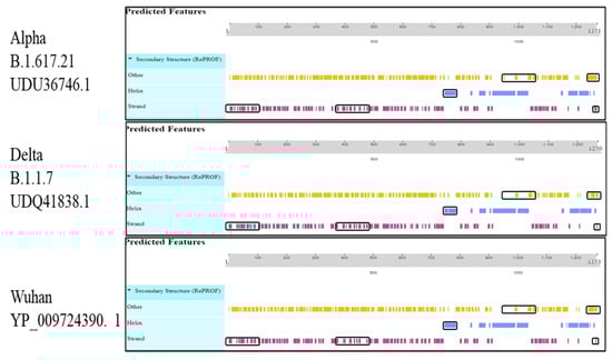 The secondary structures of the envelope protein, membrane glycoprotein, nucleocapsid phosphoprotein, ORF10 protein, ORF1a polyprotein, ORF1ab polyprotein, ORF3a protein, ORF6 protein, ORF7a protein, ORF7b protein, ORF8 protein, and surface glycoprotein of SARS-CoV-2 were predicted by using the Sopma secondary structure prediction method https://npsa-prabi.ibcp.fr/cgi-bin/npsa_automat.pl?page=/NPSA/npsa_sopma.html, accessed on 26 April 2022. By keeping the default parameters, several conformational states: 4 (helix, sheet, turn, coil); similarity threshold: 8; window width: 17 were further compared with the reference strain of SARS-CoV-2 (Wuhan) proteins, which all showed similarity and variance to each other, as shown in Table 1 []. PredictProtein (https://predictprotein.org/ accessed on 17 May 2022) was used to predict the protein structural and functional features. It was only used for those proteins with a drastic change in the secondary structure, as shown in Figure 2 and others are shown in Supplementary Materials.