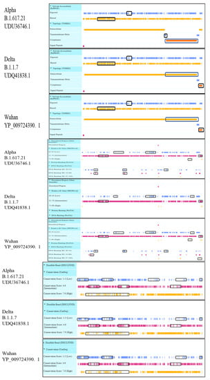 Coronaviruses have the biggest genome size ranging from 26.4 to 31.7 kb of all RNA viruses [,]. Its enormous gene size allows for greater flexibility in integrating and modifying genes [,,]. In RNA viruses, the mutation frequency is relatively high, increasing virulence and developing new species []. The greater rate of mutation within the genomes of viruses in various geographical areas is also one reason that COVID-19 is liable for the changes in the death rate and disease symptoms []. In COVID-19, we found a few additional single amino acid changes in the Alpha and Delta variants compared to the reference strain (Wuhan), as shown in the above figures.