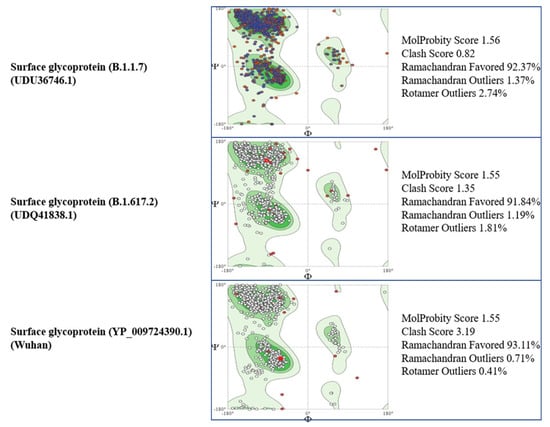 The tertiary structure details of the spike proteins were analyzed by using web online software SWISS-MODEL (https://swissmodel.expasy.org/interactive, accessed on 10 June 2022) and Ramachandran plots (https://swift.cmbi.umcn.nl/servers/html/ramaplot.html, accessed on 10 June 2022).