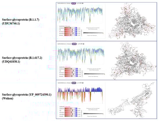 Tertiary structural details of the spike proteins were analyzed using the online software SWISSMODEL (https://swissmodel.expasy.org/interactive, accessed on 10 June 2022) and Ramachandran plots (https://swift.cmbi.umcn.nl/servers/html/ramaplot.html, accessed on 10 June 2022). Through the Swiss model, a comparison of the tertiary structure model of the SARS-CoV-2 spike protein of the Alpha and Delta variants was made with the reference strain (Wuhan), as shown in Figure 3 and Figure 4 [].