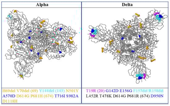 The Alpha and Delta variants of the SARS-CoV-2 isolates submitted in GISAID (https://www.epicov.org/epi3/frontend#43f233, accessed on 1 November 2021) from Pakistan with changes in the amino acids in the structural and nonstructural proteins compared with the reference strain (hCoV-19/Wuhan/WIV04/2019), as shown in Table S1 in Supplementary Materials, and the 3D structure mapping of spike glycoprotein and mutations in amino acid are shown in the Figure 5.