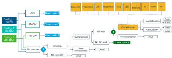 To allow comparison of different vaccination strategies, the same decision tree pathways starting from the infection stage were replicated for each vaccine (aQIV, SD-QIV, or HD-QIV), allowing outcomes from the populations immunized with each vaccine (and without immunization in the “no vaccine” arm) to be estimated separately and combined based on vaccination coverage. Two comparisons were conducted: aQIV vs. SD-QIV (strategy 1 vs. strategy 2) and aQIV vs. HD-QIV (strategy 1 vs. strategy 3). Considering all clinical events captured in the model were conditional on an influenza infection, the impact of a vaccination strategy on the population (number of events and influenza-related treatment and hospitalization costs) was driven by VE against influenza infection.