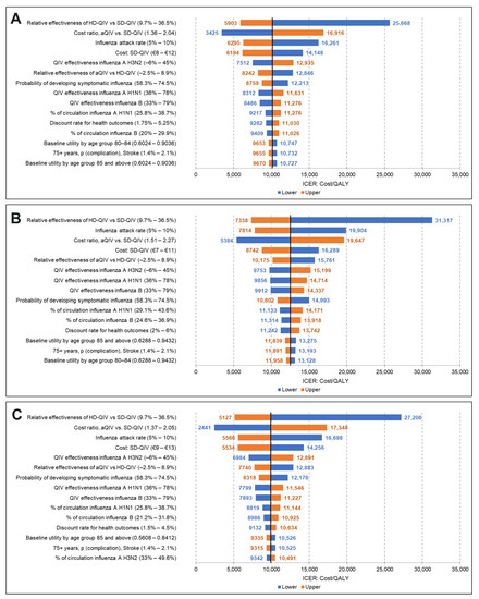 Variations on the rVE of HD-QIV vs. SD-QIV (9.7–36.5%) and aQIV vs. HD-QIV (−2.5–8.9%), strain-specific VE of SD-QIV against H3N2 (−6–45%), influenza attack rate (5–10%), and acquisition costs of both vaccines were the major drivers of the ICER for the three countries. The remaining parameters in the model had a moderate to minor impact on the ICERs. The aQIV remained a cost-effective strategy in all but one of the scenarios tested in the DSA (lower bound of rVE between aQIV and HD-QIV for Norway).