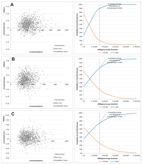 Figure 3. PSA results (aQIV vs. SD-QIV): (A) Denmark, (B) Norway, and (C) Sweden.