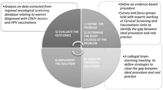 A framework of the QI strategy adopted by the Veneto Region to analyze and improve the healthcare provider regarding HPV immunization for women with CIN2+ lesions is represented in Figure 1.