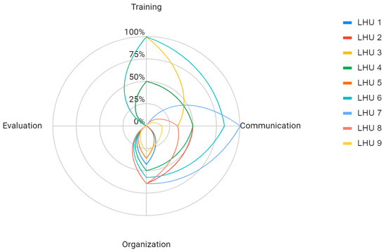 Overall results of the web page analysis, by the Local Health Unit (LHU), according to the scores detailed in Table S1. The range of numbers is [1 = critical lack; 2 = lacking content; 3 = improvable content; 4 = suboptimal content; 5 = optimal].