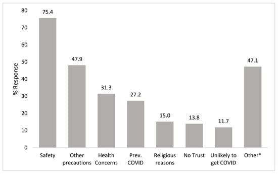 Reasons for primary-series vaccine hesitancy. * “Other” category includes write-in responses (41.4%), “I want to wait and see until more people get the vaccine” (29.1%), “My friends and/or family are not getting it” (0.7%), and “I’m concerned about what other people might think” (0.4%).