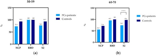 Prevalence of NCP, RBD, and S2 IgG antibodies in PCa patients and controls by age: (a) 50–59, (b) 60–70; *** statistically significant (10−3).
