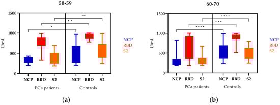 The levels of NCP, RBD, and S2 IgG antibodies in PCa patients and controls by age: (a) 50–59, (b) 60–70; Mann–Whitney U test; median (min–max); * statistically significant (10−1); ** statistically significant (10−2); *** statistically significant (10−3); **** statistically significant (10−4).