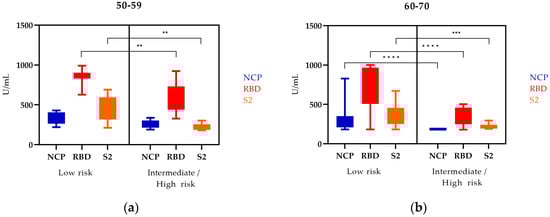 In the 50–59 age group, the levels of NCP, RBD, and S2 antibodies were higher in the low-risk group compared to the high-risk group. The differences in RBD and S2 levels in these patients were statistically significant.
