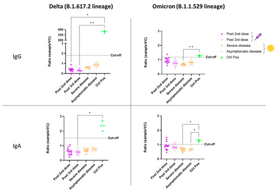 In vitro ADE of SARS-CoV-2 infection from vaccinated (syringe symbol) or COVID-19 patients (virus symbol) against Delta and Omicron variants. The ADE effect was evaluated using HEK-293 CD16+ or CD89+ cells. Each sample was tested simultaneously in both models (CD16 and CD89) and against both viral variants. The amount of virus present in the supernatant was determined after five days of infection by a SARS-CoV-2-specific RT-PCR. The ratio of the amount of virus in each sample and that in a viral control without serum (sample/VC) is shown. Each dot corresponds to the mean of duplicate values from a single patient. An anti-RBD IgG was used as the positive control for the CD16 test, and an anti-S IgA was used for CD89. Sera were used at a 1:100 dilution. The cut-off was determined as the mean value for eight pre-pandemic serum samples plus two standard deviations. The statistical significance of differences between groups in a Kruskal–Wallis test with Dunn’s tests for multiple comparisons is shown for each set of conditions (* p < 0.05; ** p < 0.01).