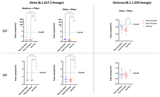 In vitro ADE of SARS-CoV-2 infection from individuals vaccinated with different vaccination schemes (heterologous: Moderna/Pfizer; or homologous: Pfizer/Pfizer). The ADE effect was evaluated with the Delta and Omicron variants, and the involvement of IgG and Ig A antibodies was assessed using HEK-293 CD16+ or CD89+ cells. Viral quantification was measured by a SARS-CoV-2-specific RT-PCR. The ratio of the amount of virus for each sample to that for a viral control without serum (sample/CV) is shown. Each dot corresponds to a single patient. An anti-RBD IgG was used as a positive control for the CD16 test, and an anti-S IgA was used for CD89. Sera were used at a 1:100 dilution. The cut-off was determined as the mean for eight pre-pandemic serum samples plus two standard deviations. The statistical significance of differences between groups in ANOVA with Tukey tests for multiple comparisons is shown for each set of conditions (** p < 0.01, **** p < 0.0001).