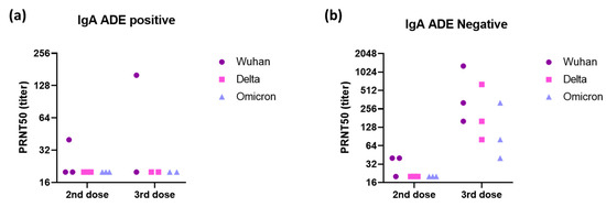 Neutralizing activity of (a) three positive and (b) three negative sera to IgA-dependent ADE against the Omicron variant (sera dilution starting at 1:20) was evaluated against Wuhan, Delta, and Omicron strains using a plaque reduction neutralization test (PRNT) with VeroE6 cells. Each dot corresponds to one patient.