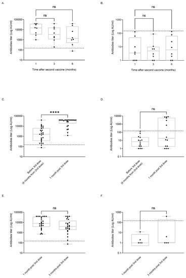 Antibody titer dynamics after the second and third vaccine doses in responders and non-responders. Antibody titer values are presented in Table S2. Titer dynamics after the second vaccine dose for responders, n = 8 (A) and non-responders, n = 8 (B). Antibody titers at 6 months from the second vaccination (before the third vaccine dose) and one month after the third vaccine dose in second dose responders, n = 25 (C) and non-responders, n = 14 (D). Antibody titer dynamics after the third vaccination in responders, n = 25 (E) and non-responders, n = 5 (F). **** p < 0.0001. ns—not significant.