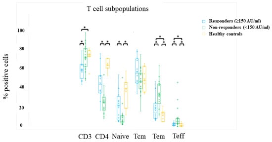 T-cell sub-populations. Comparing the abundance of T cells, T helper cells, and T helper subpopulations in vaccine responders (n = 12), non-responders (n = 18), and healthy controls (n = 7). Samples are from three to six months after the second vaccine dose. * denotes a significant difference between two compared populations (p < 0.05). Values are presented in Table S1. Tcm—T central memory; Tem—T effector memory; Teff—T effectors.