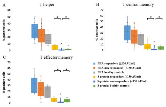 Cellular response. T-lymphocyte response to stimulation was evaluated by expression of the cellular activation markers CD134 and CD25 with flow cytometry. Samples were incubated for 48 h with PHA (positive control), no stimulation (negative control), or spike protein (test sample). Cellular response was evaluated in responding patients (antibody titers ≥ 150 AU/mL, n = 12), non-responding patients (antibody titers < 150 AU/mL, n = 18), and healthy controls (all had serological response to the vaccine, n = 7). (A) T-helper response to stimulation. (B) Central memory T-cell response to stimulation. (C) T-effector memory cell response to stimulation. There was no difference between the groups in response to PHA. Values are presented in Table S1. * p ≤ 0.001.
