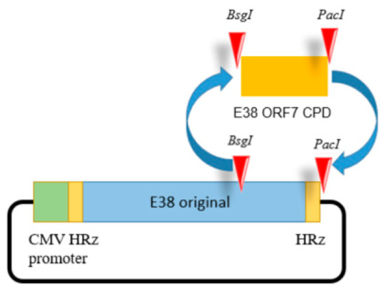 The E38-ORF7 CPD infectious clone containing the CMV promoter. The ORF7 fragment of the original E38 virus was replaced by the ORF7 attenuated fragment generated by CPD at the BsgI and PacI restriction sites. The presence of the ORF7 attenuated fragment was confirmed using PCR.