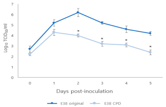 Comparison of replication kinetics of original and CPD viruses in PAM cells. The virus titers are presented as TCID50. Significant difference (p < 0.05) is indicated by ‘*’.