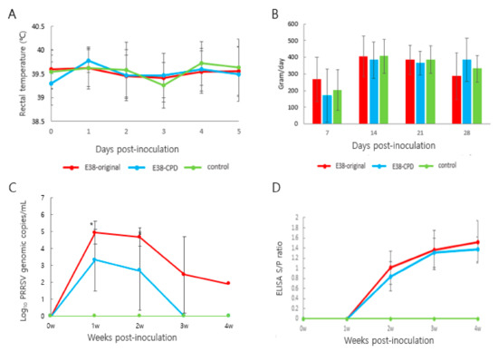 Rectal temperature was monitored for 5 days post-inoculation. Rectal temperature of animals treated with the E38 original virus and E38-ORF7 CPD did not significantly differ from that of control animals. No animal had a temperature of 40.5 °C or higher, or showed signs of anorexia or any sort of distress (Figure 3A). Daily weight gain did not significantly differ between animals in the different groups (Figure 3B).