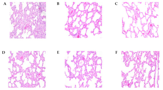 The histopathological lesions of necropsied pig lungs at 2 wpi and 4 wpi. (A) E38 original virus group lung lesions 2 weeks post-inoculation (wpi). (B) E38-ORF7 CPD group lung lesions 2 wpi. (C) Control group lung lesions 2 wpi. (D) E38 original virus group lung lesions 4 wpi. (E) E38-ORF7 CPD group lung lesions 4 wpi. (F) Control group lung lesions 4 wpi.