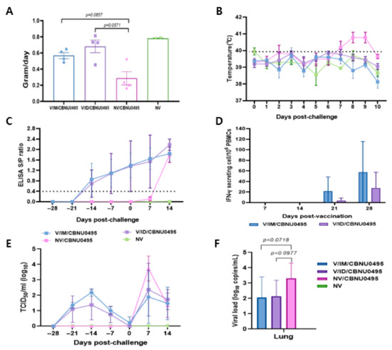The experimental animals were monitored daily for weight gain, temperature, and visible clinical changes from the day of vaccination until the end of experiment. Animals in the control group and those intramuscularly vaccinated with E38-ORF7 CPD were healthy based on their clinical appearance before challenge with the CBNU0495 virus. They exhibited anorexia for 1 dpc, but no animals in the vaccinated groups exhibited bleeding and congestion, joint edema, dyspnea, any other respiratory symptoms, or severe diarrhea. However, unvaccinated and challenged animals exhibited nasal discharge post-challenge. Average daily weight gain did not markedly differ between pigs in the 2 vaccinated groups, which was an average of 2.39 and 1.99 times higher in intradermally and intramuscularly vaccinated pigs than in unvaccinated and challenged pigs, respectively. Average daily weight gain did not significantly differ between the groups (Figure 5A).