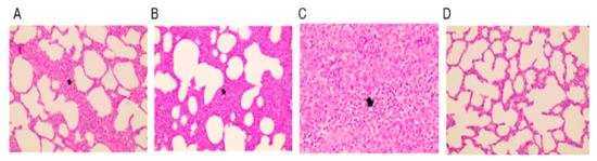Histopathological lesions in the lungs of experimental animals. (A) E38-ORF7 CPD intramuscular group (V/IM/Challenge Virus): alveoli show mild hyperplasia and cell accumulation. (B) E38-ORF7 CPD intradermal group (V/ID/Challenge Virus): the alveolar septum is slightly thicker than in animals that received the vaccine intramuscularly. (C) UnVac/Ch (Positive control): the alveolar septum is thickened with accumulation of necrotic debris and inflammatory cells. (D) UnVac/UnCh (Negative control): alveoli and the alveolar septum are clear and normal. The differences were found to be statistically significant (p < 0.05) between the vaccinated group and the positive control (unvaccinated challenged group).