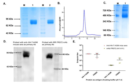 The yield of the trimeric HA-T-AGM protein was ~6–8 mg/L in the laboratory conditions in the Expi293F mammalian cells, which could be scalable and provides a rapid methodology to adapt to the pandemic threat. The protein forms higher-order oligomers and a highly stable structure and is further recognized by both homologous and heterologous antibodies (Figure 2 and Figure 3).