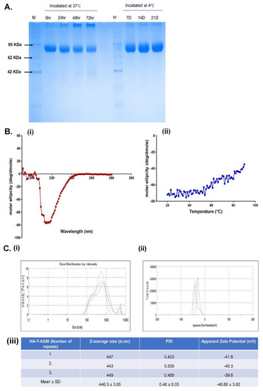 Biochemical and biophysical characterization of HA-T-AGM. (A): Thermostability profile of the protein after incubation at temperature for hours at 37 °C and days at 4 °C. (B) (i,ii): CD spectroscopy of HA-T-AGM protein. (i) Far-UV CD spectra in the wavelength range of 195–280 nm. (ii) Thermal unfolding of HA-T-AGM as monitored from 25 to 90 °C. (C): Biophysical characterization of the synthesized HA-T-AGM protein. (i) Size distribution profiling, and (ii) Apparent zeta potential distributions of the HA-T-AGM protein. (iii) Statistical analysis and quantifications of the size diameters and zeta potentials. Here, different colors in the graph represent three independent experiments.