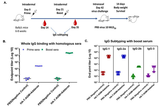 3.4. Intradermal Administration of HA-T-AGM Soluble Antigens in BALB/c Mice Elicited Robust Humoral Responses and Provides Complete Protection against High-Dose Lethal Challenge