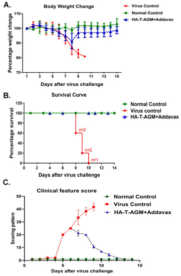 Protection by HA-T-AGM antigen against virus challenge. (A): Weight change in immunized mice followed for 14 days post virus challenge (Inf A/Puerto Rico/8/34 (PR8)), and comparison made to the immunized vs. non-immunized (virus control) group along with normal naïve control mice group. (B): Survival curve showing the number of dead mice after virus exposure with days passing. (C): The animals were scored from day 1 to day 14 after the virus challenge. The scoring scheme followed from 1–10 where 1 shows NAD (No abnormality), 2 was D (Dull), 3 was MP (Mild piloerection), 4 was PE (Piloerection), 5 was RFD (Reduction in food intake), 6 was reduced movement, huddling (RMH) 7 was H (Hunched), 8 was S (Shivering), 9 was SS (Severe shivering) and 10 represents HLI (Hind limb injury).