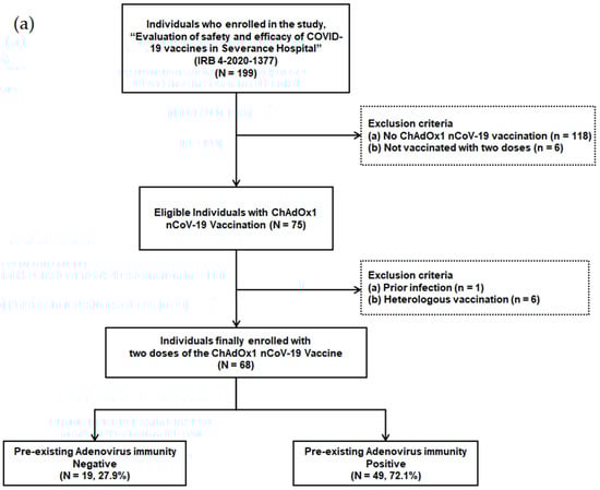Individuals scheduled for COVID-19 vaccination among patients and health care workers were prospectively enrolled in a tertiary hospital with 2400 beds starting from March 2020. The ChAdOx1 nCoV-19 vaccination was administered from 8 March 2021. Individuals who were not vaccinated with two doses (n = 6), individuals who received heterologous vaccination (n = 6), individuals who were not vaccinated with the ChAdOx1 nCoV-19 vaccine (n = 118), and individuals with a history of previous infection (n = 1) were excluded from the study (Figure 1a). A total of 68 adult individuals that received two doses of the ChAdOx1 nCoV-19 vaccine were finally enrolled.
