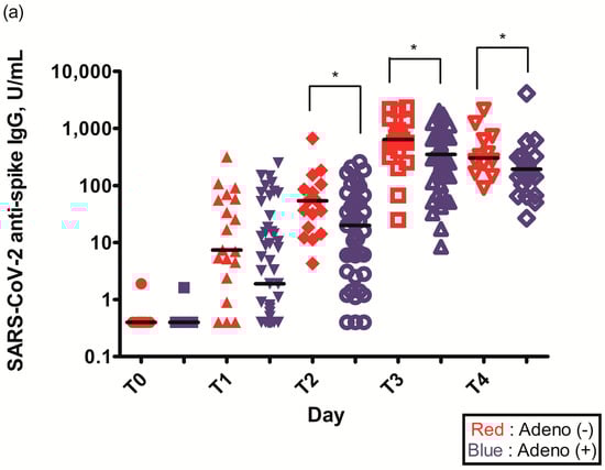 (a) Spike (S)-specific IgG titers after ChAdOx1 nCoV-19 vaccination according to pre-existing adenovirus immunity; (b) Plaque reduction neutralization test (PRNT50) data after ChAdOx1 nCoV-19 vaccination according to pre-existing adenovirus immunity; *, p < 0.05.