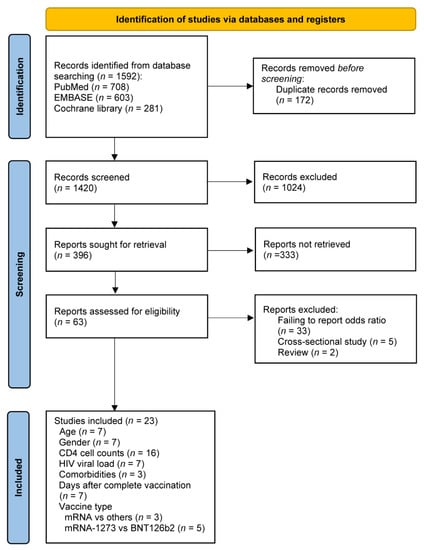 Increasing individual studies have attempted to identify the factors associated with the effectiveness of vaccination against COVID-19 [10,11,12]. For example, Anais et al. [13] found that the seroconversion rate was slightly lower among PLWH with CD4 T-cell counts of <350 cell/mm3 and dramatically reduced among those with CD4 T-cell counts of <200 cell/mm3. Moreover, the type of vaccine, the presence of comorbidities, and HIV status might preclude the development of a protective immunological response. However, the lack of studies with large sample sizes highlights the importance of a comprehensive analysis of the potential predictors for seroconversion due to the COVID-19 vaccine in PLWH.