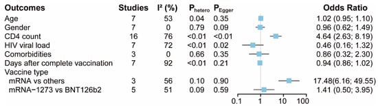 According to the GRADE approach, the quality of evidence was very low for age, gender, CD4 T-cell counts, HIV viral load, comorbidities, days after complete vaccination, and vaccine-type impact factors (Table S4).
