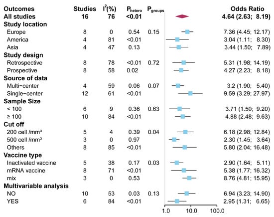 Considering the potential predictive value of the CD4 T-cell counts in seroconversion due to the COVID-19 vaccines in PLWH, univariate meta-regression and subgroup analyses were further carried out to explore the source of heterogeneity. The univariate meta-regression found no significant moderators of heterogeneity (Table S3). All the subgroup analyses arrived at a consistent conclusion (OR range, 2.30 to 9.59) (Figure 3 and Figures S9–S15). Interestingly, a subgroup analysis, conducted according to the cutoff of CD4 T-cell counts, demonstrated that the odds ratio was highest in the cutoff for 200 cell/mm3 (OR = 6.18, 95% CI 2.98 to 12.84), followed by the cutoff for others (OR = 5.80, 95% CI 2.04 to 16.48), and a cutoff for 500 cell/mm3 (OR = 2.30, 95% CI 1.45 to 3.64) (p = 0.04) (Figure 3 and Figure S13). Subgroup analysis, stratified by vaccine type, showed that the odds ratio was lowest when patients received the inactivated vaccine (OR = 2.90, 95% CI 1.64 to 5.11), followed by the mRNA vaccine (OR = 5.38, 95% CI 1.77 to 16.32), and mixed vaccines-type (OR = 8.76, 95% CI 4.81 to 15.95) (p = 0.03) (Figure 3 and Figure S14). No significant heterogeneity was observed in the other subgroup comparisons (all p > 0.05).