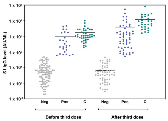 Figure 1. Seropositivity among LTRs and control group before and after the third vaccine dose. A column scatter plot graph representing the BNT162b2 vaccine-induced S1-IgG antibody levels (AU/mL) in lung transplant recipients and control group before and after the third vaccine dose. The bars represent median values. Abbreviations: LTRs, lung transplant recipients; AU, antibody units; Neg, LTRs with seronegative antibody titer: Pos, LTRs with seropositive antibody titer; C, control group antibody titer.