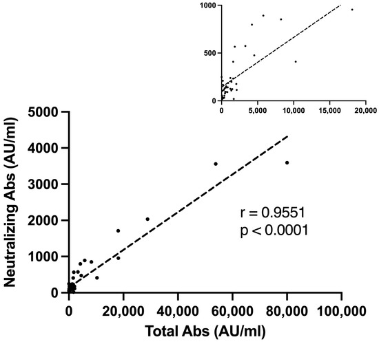 Figure 2. Neutralizing antibodies and seropositive s-IgG titer Correlation. A Pearson correlation plot representing the correlation between S1-IgG antibody levels (AU/mL) and neutralizing antibody titer among vaccinated lung transplant recipients. The small upper Pearson correlation plot represents a magnified view with a scale of 5000 Total Abs (AU/mL). Abs, antibodies; AU, antibody units.