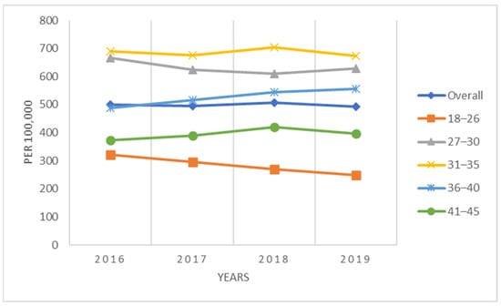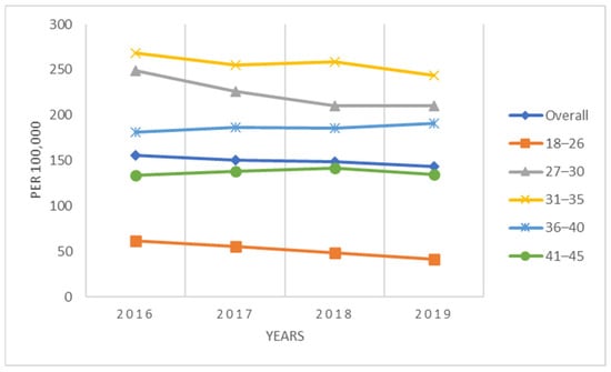 The date of the conization procedure served as the index date. Patients were required to have at least 6 months of continuous enrollment during the same calendar year as the index date and were excluded if they had any claim for pregnancy or delivery in that calendar year. Annual incidence rates (per 100,000 women-years) were calculated for 2016–2019 and were stratified into five age groups. The first age stratum is composed of women 18–26 years [32,33]. The age strata for women aged 27–45 are presented in smaller increments. The rates were calculated using the following formula (Formula (1)):