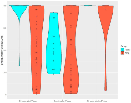 After the second vaccine dose, 37 patients and 23 controls provided serum samples for immunogenicity; 36 patients and 14 controls provided serum samples 6 months later. A total of nine patients and nine controls provided samples after the third vaccine. The dynamics of the S1/S2 antibody level among both study groups are presented in Figure 1 and Figure 2. Among the control group, the seropositivity rate was 100% at all three time points. Anti-S1/S2 antibody titers declined at 6 months after the second vaccine from a mean of 388.3 (SD 56.09) BAU/mL to 212.93 (SD 93.69) BAU/mL, and was restored shortly after the third vaccine dose, to 400 (SD 0) BAU/mL. As expected, the seropositivity rate was lower among AIIRD patients compared to controls, 91% at 2–8 weeks and 87% at 6 months after the second vaccination, and returned to 100% following the third dose. Anti-S1/S2 antibody titers declined at 6 months after the second vaccine from a mean of 243.1 (SD 140.8) BAU/mL to 216.9 (SD 157.6) BAU/mL and increased shortly after the third vaccine dose to 355.8 (SD 126.4) BAU/mL. In comparison to the control group, anti-S1/S2 antibody titers among the patients were significantly lower only at 2–8 weeks after the second vaccine dose (p < 0.0001), and there was also a wide range of antibody titers in the patient group as compared to the controls. The anti-S1/S2 antibody titers among the patients were comparable to the control group at the subsequent 6-month follow-up after the second and 2–8 weeks after the third dose. Notably, the decline of the anti-S1/S2 antibody titers within 6 months after the second vaccine dose was significantly steeper among the controls compared to patients, with a mean of −197 (SD 87.4) vs. −61.2 (SD 151.4), p = 0.0197, respectively. In the limited sample of controls (n = 5) and patients (n = 2) with available serologic data, the increase in the antibody titer after the third vaccine dose was comparable in both groups.