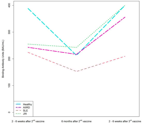 The study population included adolescents (ages 12–18 years) with juvenile-onset of the following AIIRDs: Juvenile Idiopathic Arthritis (JIA) according to the EULAR 2001 classification criteria [19]; systemic lupus erythematosus (SLE) according to the 1997 ACR or 2012 SLICC criteria [20]; systemic vasculitis, i.e., ANCA-associated vasculitis (AAV), including granulomatosis with polyangiitis (GPA), according to the Chapel Hill Consensus Conference definitions [21]; Behçet’s disease, idiopathic uveitis, IBD-related arthritis, systemic or localized scleroderma or juvenile dermatomyositis according to the EULAR/ACR classification criteria [22]; or autoinflammatory syndromes [23,24]. Patients were instructed to continue all medications during the vaccination period. Patients were recruited from four medical centers, including 97 (78%) participants from Israel and 27 (22%) from Slovenia. The control group consisted of healthy adolescent volunteers recruited by Dana Dwek Children’s Hospital, who provided blood samples during a well-being visit. Exclusion criteria were previous COVID-19 infection, and for controls, a history of AIIRDs or immunosuppressive treatment.