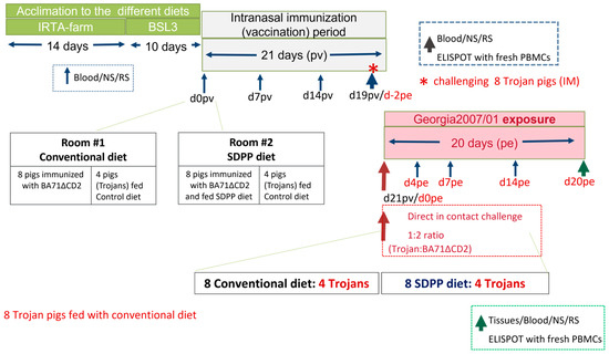 After acclimation, eight pigs from Room 1 (left pen), fed the conventional diet, and eight pigs from Room 2 (left pen), fed the SDPP diet, were intranasally immunized (1 mL per nostril) with a dose of 105 PFU of BA71ΔCD2 ASFV. The rest of the pigs (eight), four located in the right half of Room 1 and four in the right half of Room 2, continued to be fed the conventional diet. Therefore, the donor animals (Trojans) for both groups were fed the same control diet.