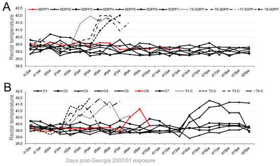 Rectal temperature recorded individually after Georgia 2007/01 exposure of pigs intranasally inoculated with 105 PFU of BA71∆CD2. Data from pigs fed (A) the SDPP diet (SDPP1-7 pigs) or (B) the conventional diet (C1–C7 pigs). T1–T8 (dashed lines): Trojan pigs used for the direct contact challenge. In red color, animals that died before the end of the study.