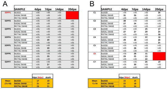 Ct values obtained by qPCR using blood, nasal and rectal swabs from individual animals at different times post-Georgia 2007/01 exposure (pe). Data from pigs fed (A) the SDPP diet (SDPP1-7 pigs) or (B) the conventional diet (C1–C7 pigs). The higher the Ct values, the lower the ASFV load, with Ct values > 35 being considered negative (cut-off of the technique). Tables in orange show the average Ct values obtained in samples from Trojan pigs. Animals in red color died before the end of the experiment.