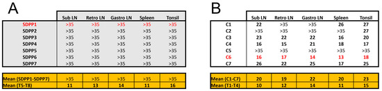 Ct values obtained by qPCR from different tissue samples of individual animals at the end of post-Georgia 2007/01 exposure (d20pe). Data from pigs (A) fed the SDPP diet (SDPP1-7 pigs) or (B) the conventional diet (C1–C7 pigs). The higher the Ct values, the lower the ASFV load, with Ct values > 35 being considered negative (cut-off of the technique). Tables in orange show the average Ct values obtained in samples from Trojan pigs. Animals in red color died before the end of the experiment. Abbreviations: Sub LN = Submaxillary lymph nodes; Retro LN = Retropharyngeal lymph nodes; Gastro LN = Gastro-hepatic lymph nodes.