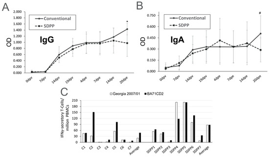 ASFV-specific immune responses analyzed in BA71∆CD2-vaccinated pigs before and after Georgia 2007/01 challenge. ASFV-IgG (A) and IgA (B) antibodies from sera quantified by ELISA. Average values for SDPP-fed pigs (SDPP1-7) are shown as dashed lines, while solid lines represent average values for pigs fed the conventional diet (C1–C7). Standard deviation values are shown. (C) Number of ASFV-specific IFNγ-secreting T cells found at d9pe by ELISPOT in PBMCs upon in vitro stimulation with either the pandemic Georgia 2007/01 (white boxes) or the BA71∆CD2 vaccine (black boxes). * = p < 0.05; # = p < 0.1.