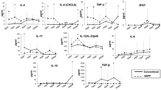 Plasma samples obtained from pigs were stored at −75 °C until use. Once thawed, levels of IFNα, IFNγ, IL-1β, IL-10, IL-12/IL-23p40, IL-4, IL-6, IL-8, and TNFα in plasma were quantified using the Luminex xMAP technology following the manufacturer’s instructions (ProcartaPlex Porcine Cytokine & Chemokine Panel 1; ThermoFisher Scientific, Waltham, MA, USA). The concentrations of each cytokine were calculated using xPONENT software (Luminex, Austin, TX, USA). Levels of TGFβ and IL-17α were quantified with ELISA (KingFisher Biotech, Saint Paul, MN, USA, [DIY0730S-003] and Invitrogen [CHC1683Kit], Waltham, MA, USA, respectively), following the manufacturer’s instructions.